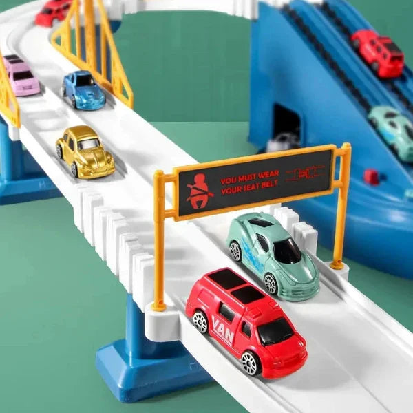 As peças flexíveis encaixam facilmente, permitindo que a criança mude o formato sempre que quiser — desde pistas longas e sinuosas até circuitos circulares ou construções em vários níveis. Isto estimula a criatividade, o raciocínio lógico e a motricidade fina.